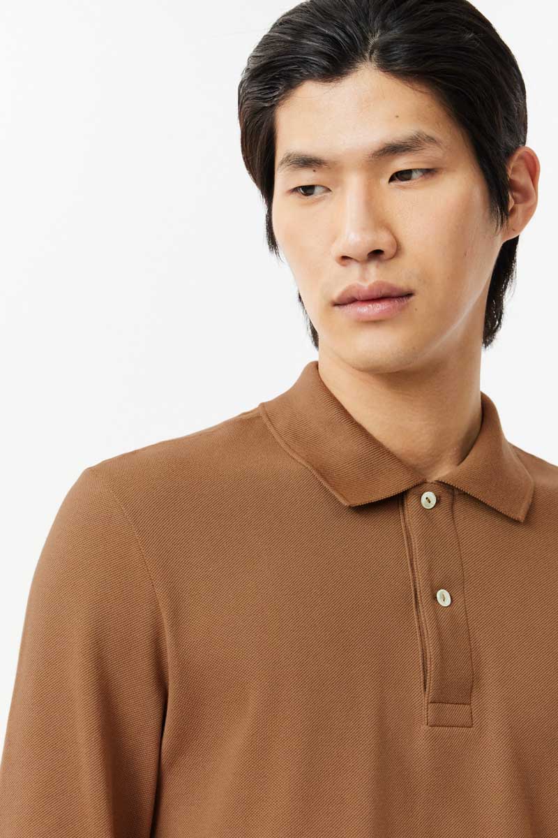 The first polo shirt in history, with its collar, button placket, Petit Piqué knitted with two levels of tension and its crocodile logo made from 2367 stitches, is here complemented with long sleeves.