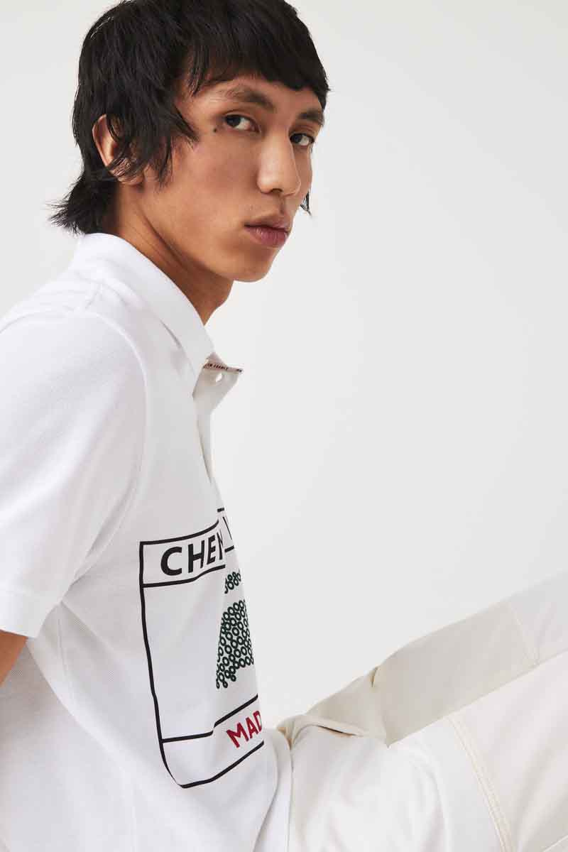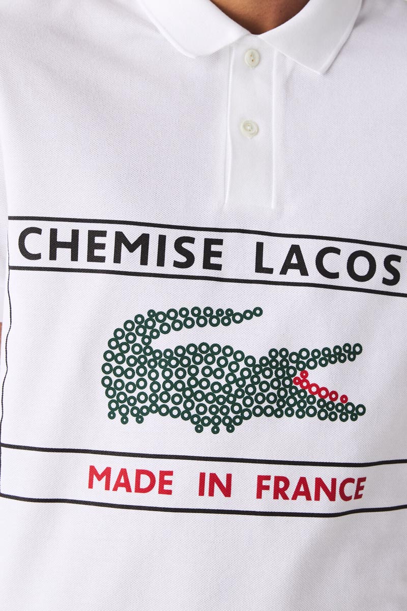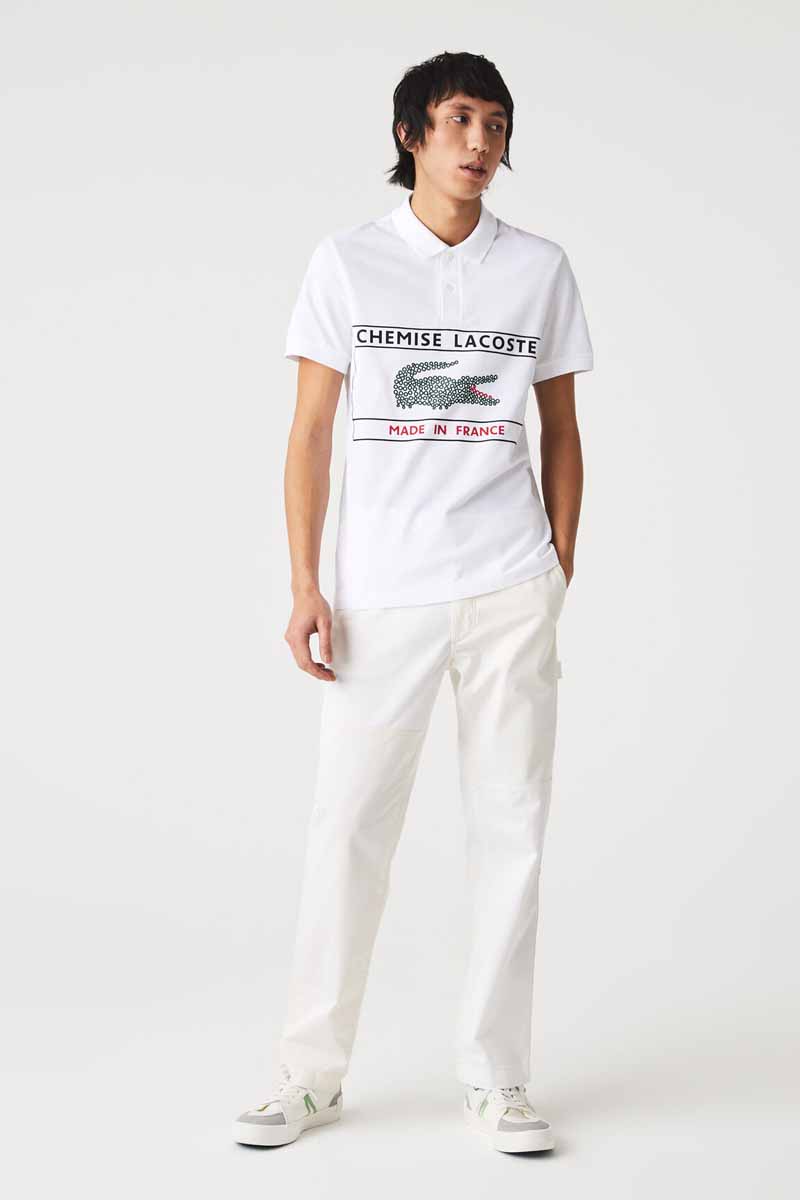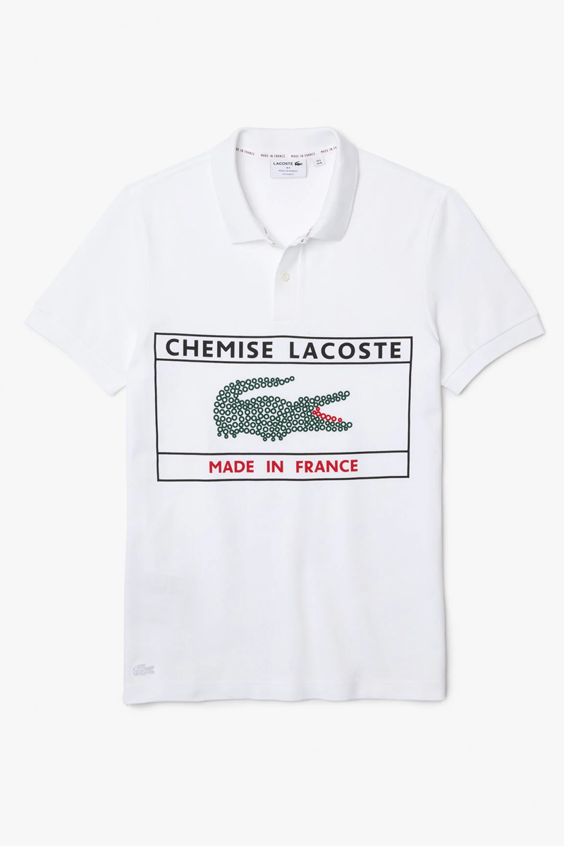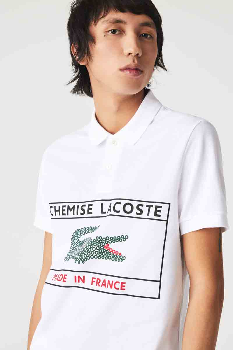 - Inspired by the brand’s archives, this iconic polo features a “Chemise Lacoste Made in France” print this season.